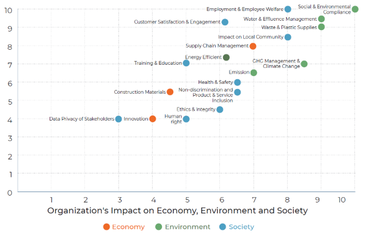 บริษัทฯ นำประเด็นที่มีนัยสำคัญต่อองค์กร โดยเฉพาะประเด็นที่เกี่ยวกับผลกระทบและความคาดหวังของผู้มีส่วนได้เสีย ทุกกลุ่ม รวมถึงแนวโน้มด้านความยั่งยืนในกลุ่มอสังหาริมทรัพย์และก่อสร้าง เพื่อจัดลำดับความสำคัญและวิเคราะห์ กำหนดเป็นประเด็นที่มีนัยสำคัญ (Materiality) ต่อการพัฒนาที่ยั่งยืน จากนั้นให้ค่าคะแนน โดยพิจารณาตามความสำคัญเพื่อกำหนดประเด็นลงตาราง Materiality Matrix ในแกนตั้ง คือ ระดับอิทธิพลต่อการประเมินและตัดสินใจของผู้มีส่วนได้เสีย และแกนนอน คือ ระดับนัยสำคัญของผลกระทบทางเศรษฐกิจ สังคม และสิ่งแวดล้อม