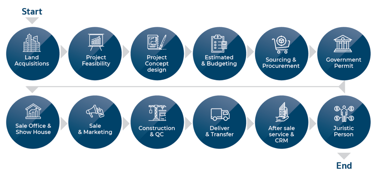 บริษัทฯ มุ่งเน้นที่จะเป็นผู้นำในการสร้างประสบการณ์การอยู่อาศัยที่มีคุณค่าผ่านกระบวนการออกแบบ อย่างเข้าใจถึงความต้องการของลูกค้าในทุกมิติ ผ่านการสร้างสรรค์ผลิตภัณฑ์ และทางเลือกของการอยู่อาศัยแบบครบวงจร เพื่อการเติบโตอย่างยั่งยืน ดังนั้น บริษัทฯ จึงมุ่งเน้นกระบวนการทำงานที่ครอบคลุมทั้งห่วงโซ่ธุรกิจ เพื่อส่งมอบผลิตภัณฑ์ที่มีคุณภาพ และงานบริการที่ดีให้กับลูกค้า โดยกระบวนการทำงานตั้งแต่การเริ่มต้น จนถึงขั้นตอนสุดท้าย พร้อมกับการบริการลูกค้า หลังการขาย โดยกระบวนการทำงานหลักขององค์กรมีขั้นตอน ดังต่อไปนี้