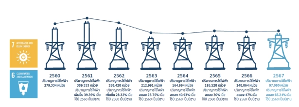จากการดำเนินการดังกล่าว ส่งผลให้สำนักงานใหญ่ ใช้พลังงานไฟฟ้ารวมทั้งสิ้น 212,449 กิโลวัตต์ ลดลงจากปี 2566 ร้อยละ 9.9 และลดลงจากปี 2564 ร้อยละ 36.7 เมื่อเทียบกับปีฐาน