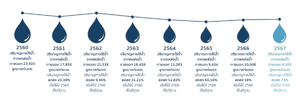 ภาพรวมในปี 2567 ปริมาณการใช้น้ำของสำนักงานใหญ่และโรงงานลดลงจากปี 2566 คิดเป็นร้อยละ 35.36 เป็นผลมาจากการวางแผนการผลิตโดยการลดการสต็อคสินค้าคงคลังที่เกินความจำเป็น และการเลือกใช้น้ำจากลำคลองในการล้างและทำความสะอาดเครื่องจักร และได้มีนโยบายรณรงค์ลดการใช้พลังงานน้ำอย่างต่อเนื่อง มีการสื่อสารภายในองค์กร ให้ผู้บริหารและพนักงานตระหนักถึงการใช้พลังงานอย่างรู้คุณค่า