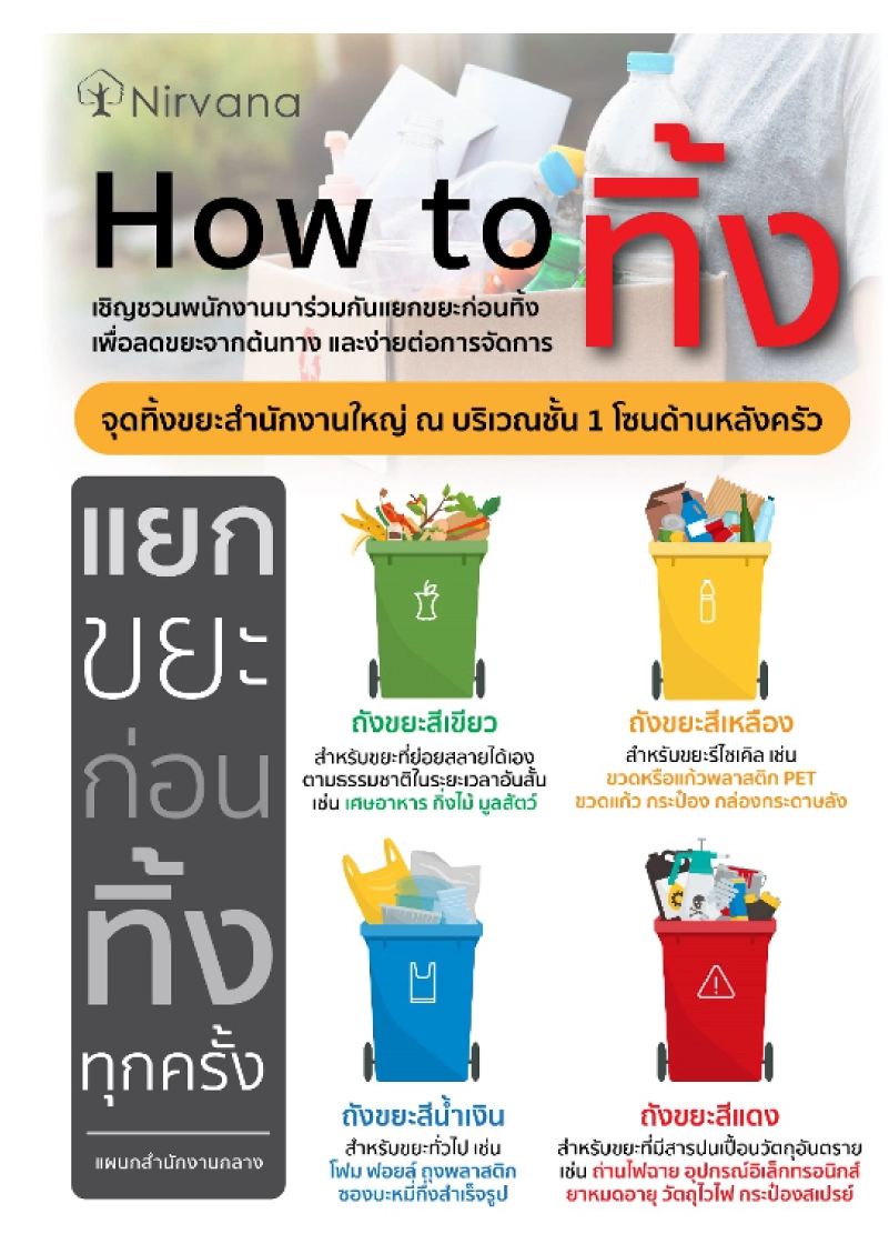 - ขอความร่วมมือพนักงานที่อยู่ภายในสำนักงานให้คัดแยกประเภทขยะก่อนนำไปทิ้งขยะ เพื่อเป็นการรณรงค์สร้างจิตสำนึกให้แก่พนักงานในการรู้จักวิธีคัดแยกขยะ และเป็นการต่อยอดจากโครงการ 3R+1 โดยการนำขยะที่สามารถ Reuse หรือ Recycle นำมาใช้ใหม่ให้เกิดคุณค่าสูงสุด เพื่อเป็นการลดการใช้ทรัพยากรที่เกิดขึ้นในการผลิต และกำจัดของเสียจากสำนักงาน