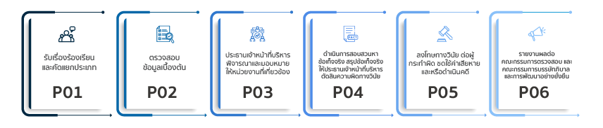ผู้รับแจ้งข้อร้องเรียนจะเป็นผู้ดูแล รวบรวม กลั่นกรองข้อมูล และนําส่งเรื่องร้องเรียนต่างๆ ให้แก่ประธานเจ้าหน้าที่บริหารเพื่อพิจารณาในเบื้องต้น หลังจากนั้น ประธานเจ้าหน้าที่บริหารจะเป็นผู้พิจารณามอบหมายให้หน่วยงานตรวจสอบภายใน และ/หรือ หน่วยงานกํากับดูแลการปฏิบัติงานของบริษัทฯ และ/หรือ แต่งตั้งคณะกรรมการตรวจสอบเป็นผู้ตรวจสอบความถูกต้องและความเพียงพอของข้อมูล รวมถึงข้อเท็จจริงต่างๆ เพื่อดําเนินการสอบสวน ภายหลังการสอบสวนข้อเท็จจริง ในกรณีที่พบว่ามีมูลความจริง หน่วยงานที่ได้รับมอบหมายจะเป็นผู้สรุปรายงาน และเสนอรายงานต่อประธานเจ้าหน้าที่บริหาร คณะกรรมการตรวจสอบ และคณะกรรมการบรรษัทภิบาลและการพัฒนาอย่างยั่งยืน เพื่อพิจารณาการดําเนินการข้อร้องเรียนต่อไป